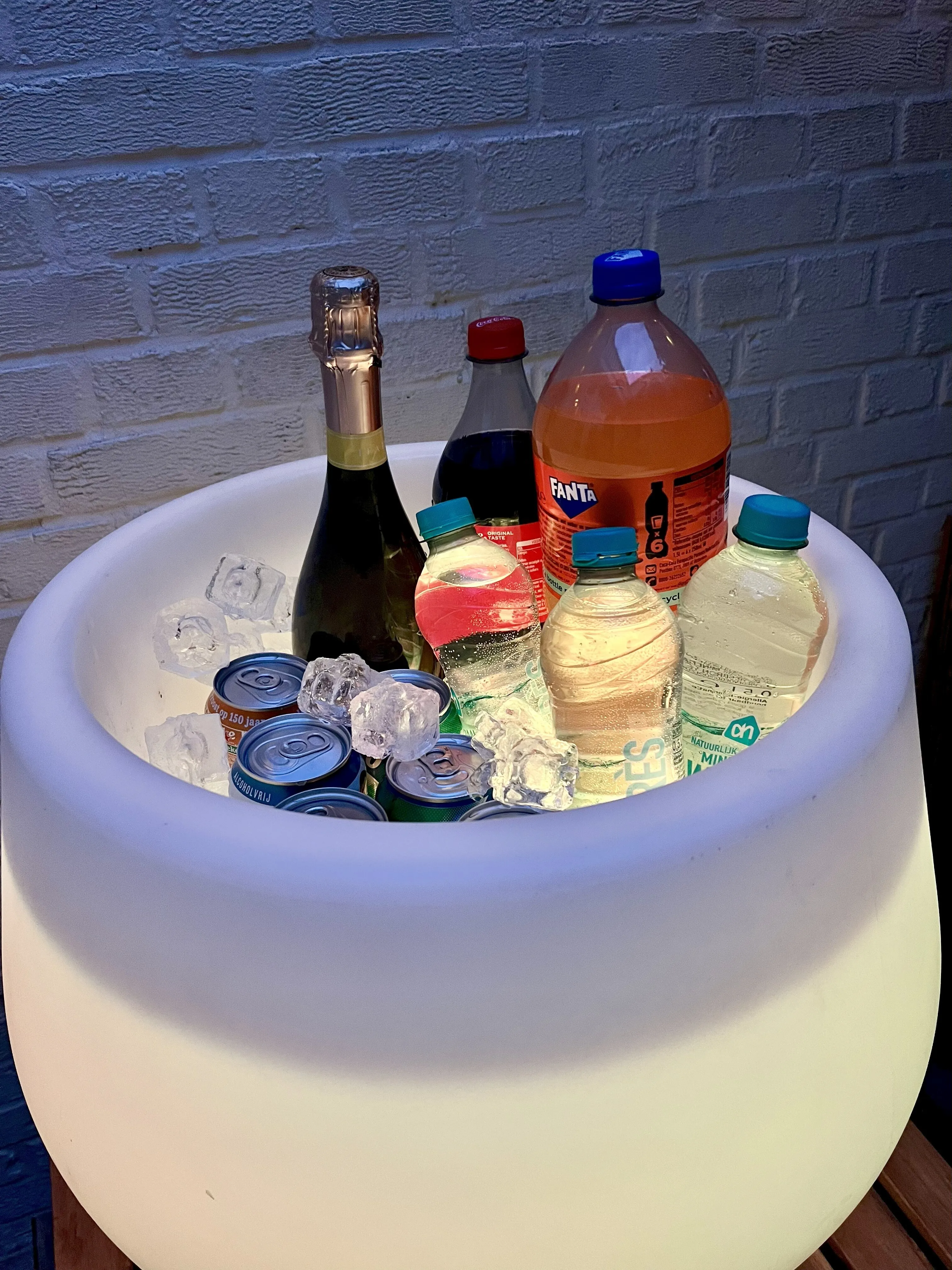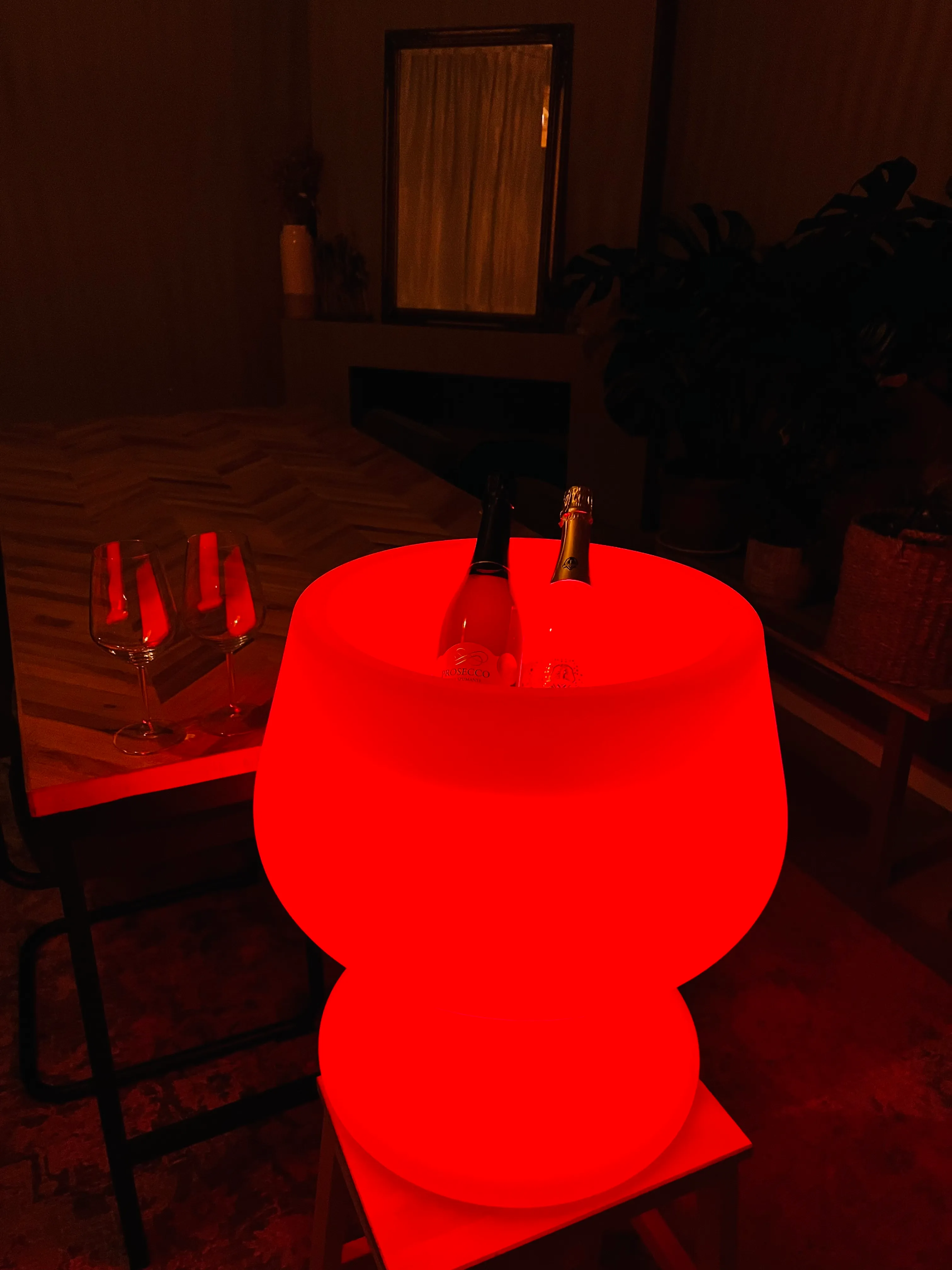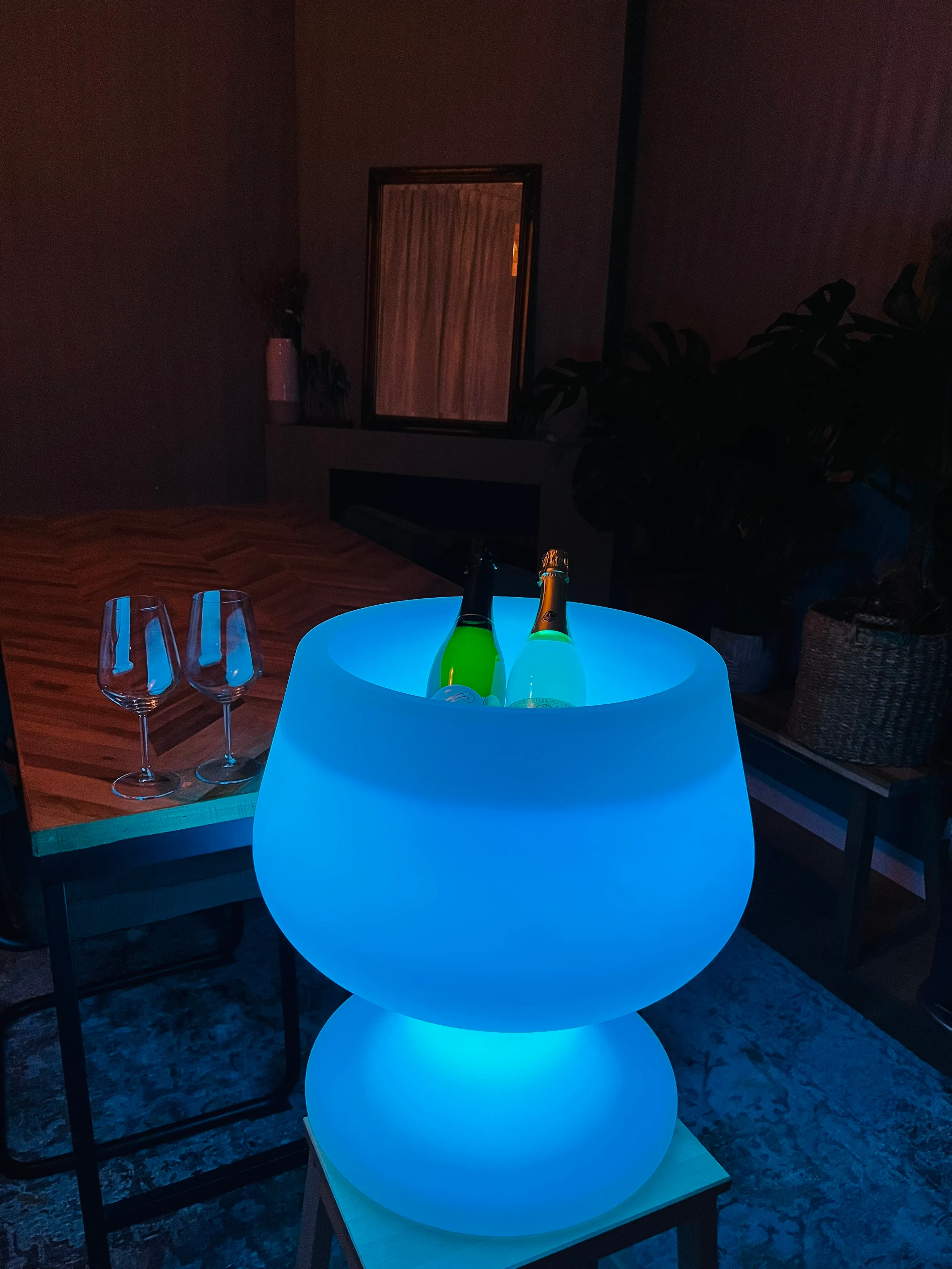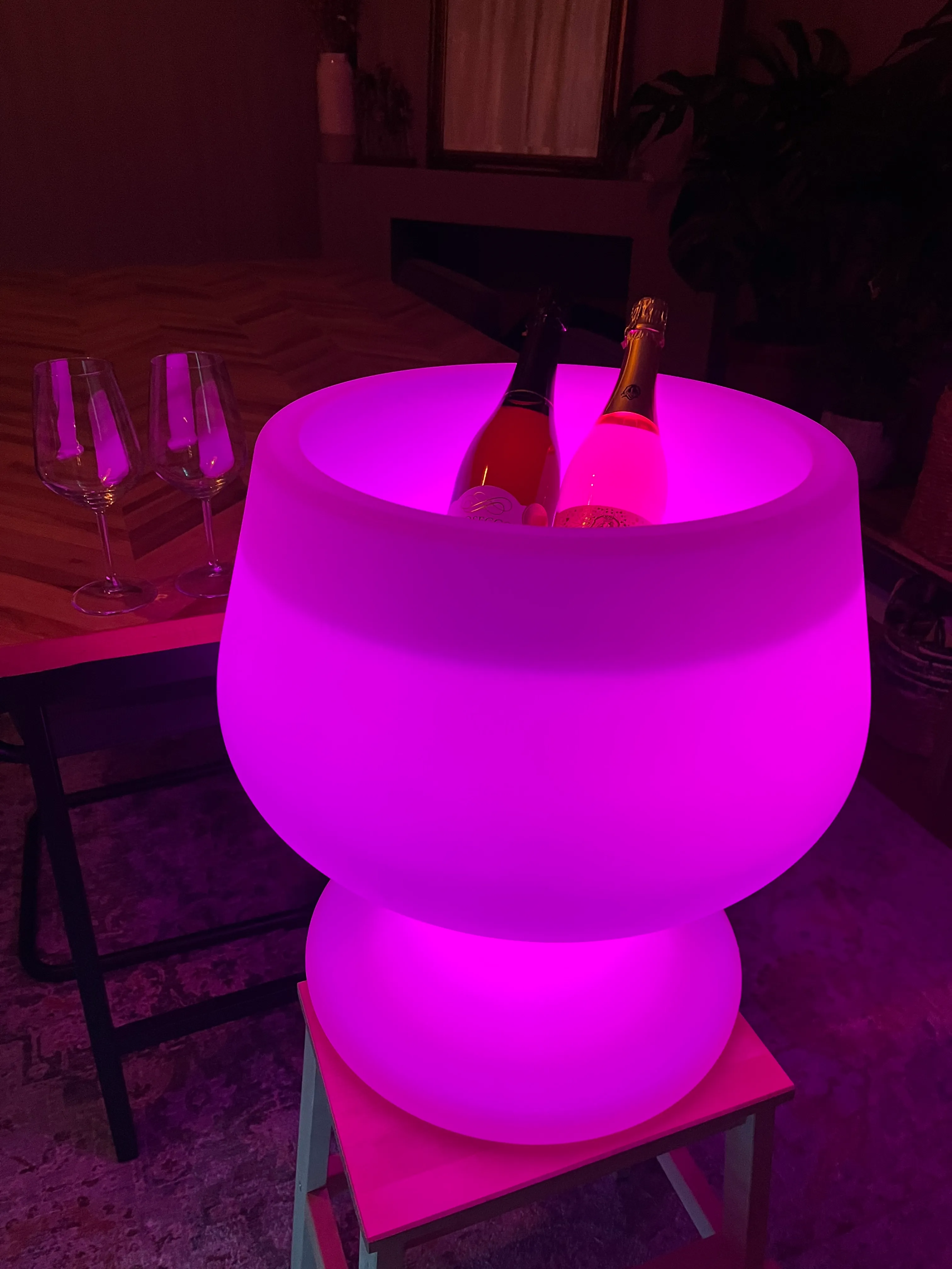 Sfeervol koelen op je feest met deze LED ice bucket in de vorm van een wijnglas. Dit is een echte eyecatcher voor jouw feest of event en biedt daarnaast een hoop gemak. Zorg voor een plek waar jouw gasten zelf hun drankjes kunnen verzorgen, waardoor jij er echt kan zijn voor jouw gasten. Deze stijlvolle bucket biedt ruimte voor een volledig krat bier of meerdere flessen wijn en champagne op ijs. Met 16 kleuren, 4 lichteffecten, 3 lichtsterktes en instelbaar overgangstempo creëer je altijd de juiste sfeer. De bucket is weersbestendig (IP44), werkt tot ca. 8 uur op een volle accu en is eenvoudig op afstand te bedienen. Afmetingen: 50 x 50 x 52 cm. Alleen te huur bij LED’s Celebrate, meer geschikt voor op een lage bijzettafel dan op een tafel waar aan wordt gezeten. Ontdek de meest sfeervolle manier van koelen.