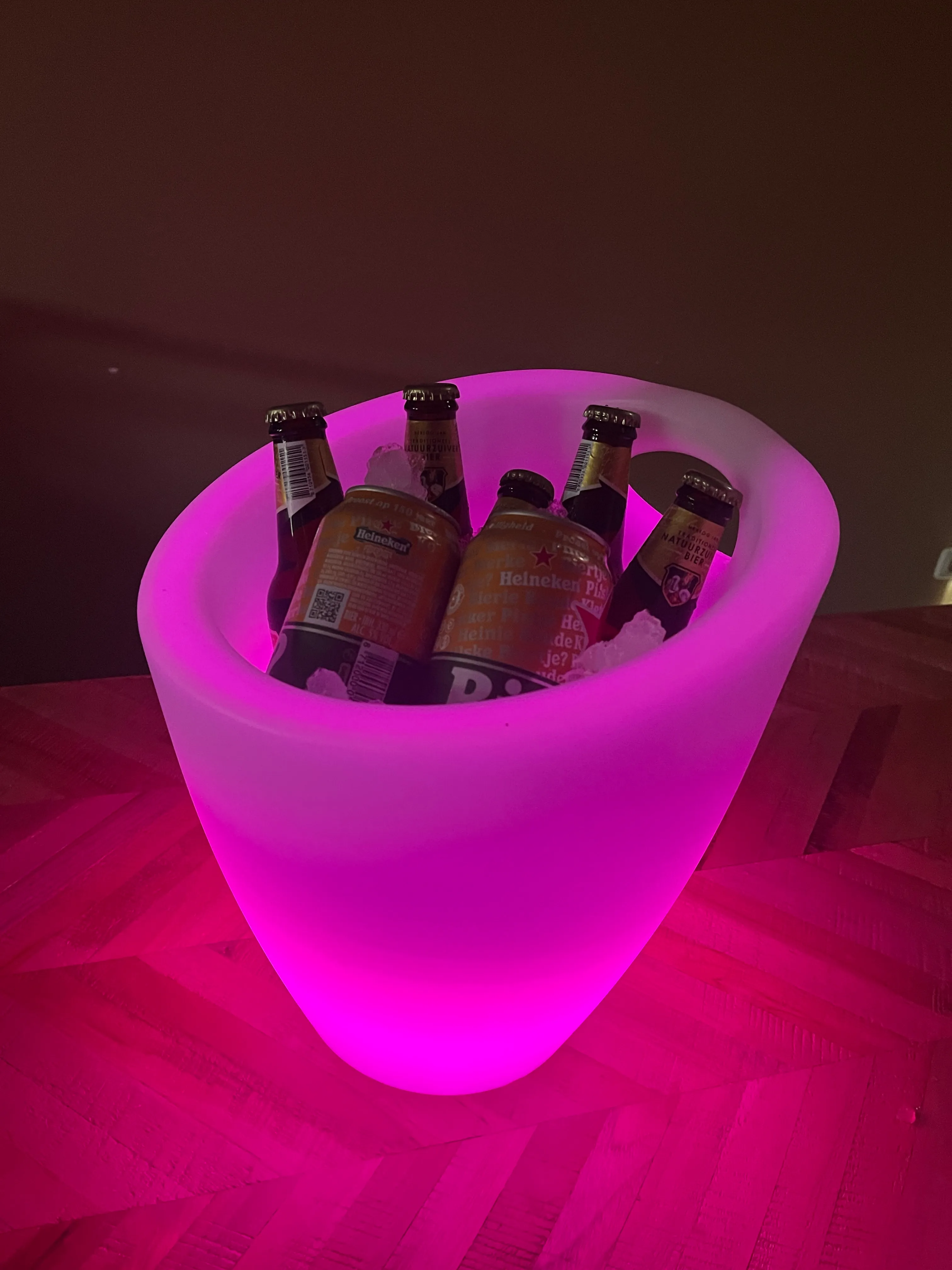 De LED wijnkoeler Horeca is een compact en praktisch model (Ø27 x H30 cm) dat perfect past bij bars, tafels of als onderdeel van een bottle service. Ondanks het kleinere formaat biedt deze koeler ruimte voor meerdere flessen en zorgt hij voor een luxe presentatie van wijn en champagne. Net als al onze LED-items beschikt de wijnkoeler over 16 kleuren, 4 lichteffecten en 3 lichtsterktes. Hij is draadloos, spatwaterdicht (IP44) en tot ca. 8 uur te gebruiken op één accu. Ideaal voor zowel kleine borrels als bij bedrijfsevents op de tafels. De kleuren zijn perfect af te stemmen.
